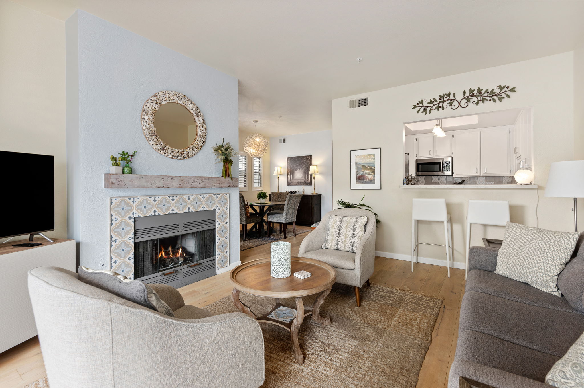 Delightful Carpinteria Coastal Retreat.  This two bedroom, two and one half bath end unit townhome in the Beachgrove condominium complex is the ideal home for upscale, easy going beach town life! The bright and stylish kitchen is open to the dining area and living room, with a beautiful tile fireplace.   You can enjoy morning coffee or bbq on your brick, and garden patio.  Upstairs each bedroom has an on-suite bath, a large walk in closet, and access to a sunny balcony.   Covered parking with additional storage is near the front door. There is one additional uncovered parking space. HOA fees of $686 include a lovely pool and greenbelt area, and insurance. Nearby you can explore the Salt Marsh Preserve and the charming town of Carpinteria.  Ideal as a full- or part-time home.