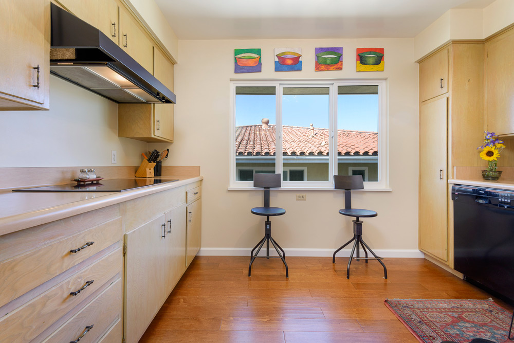 VERY special interior location in charming Villa Constance North. Spacious rooms throughout this bright-airy top floor end unit, w/ brand new wood floors, updated kitchen, new appliances. Large windows fill the rooms with natural light & provide views of greenbelt, trees, pool and quintessential Spanish tile roofs. Rare private 2 car garage. Conveniently located close to down town & shopping!